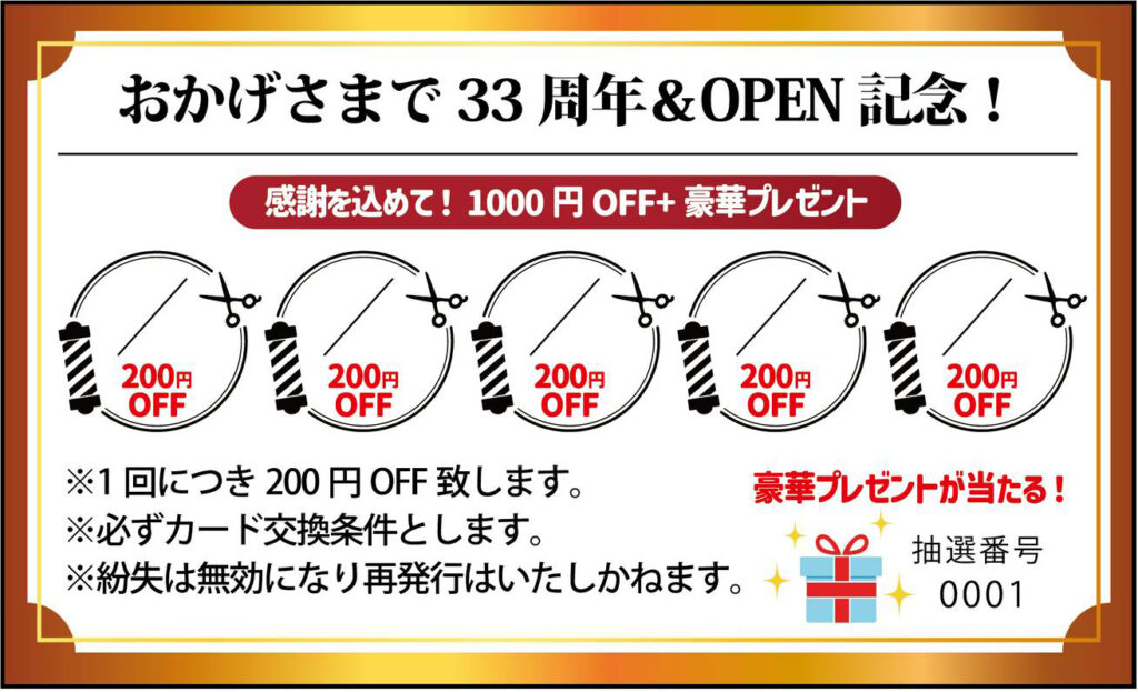 ヘアーカット割引カード(1,000円分)を【300円】でご購入いただくと、そのカードに記載された「抽選番号」でご参加いただけます。